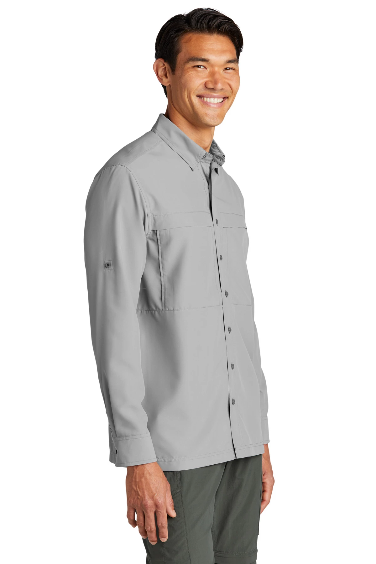 • Roll sleeves with button tabs