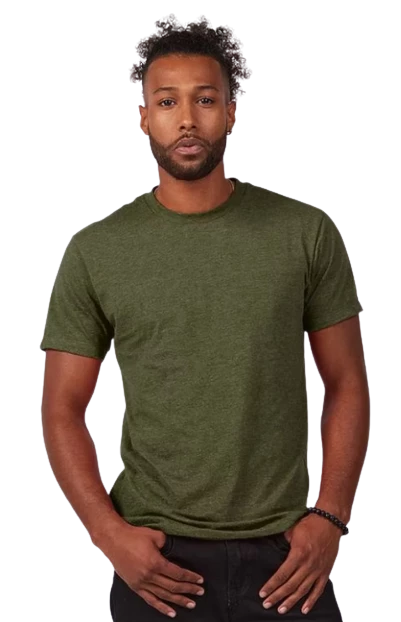 4.3 oz., 50/50 combed ringspun USA premium cotton/polyester fine jersey, 30 singles